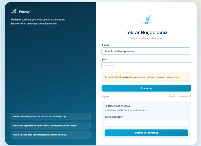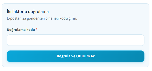 Sistem, kayıtlı e-posta adresinize 6 haneli bir doğrulama kodu gönderir. E-postanızı kontrol edin.